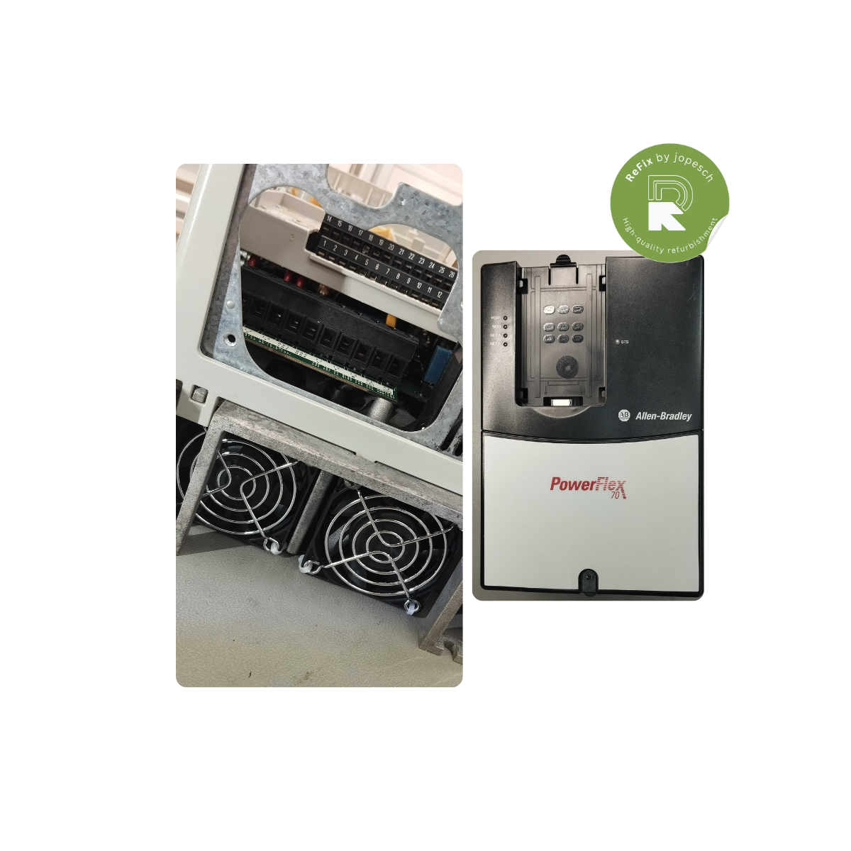 Dieser Allen Bradley PowerFlex Umrichter erreichte uns in einem Zustand extremer Verschmutzung durch Öl, Staub und Feuchtigkeit. Das Gehäuse war spröde, die Lüfter blockiert und verschlissen: