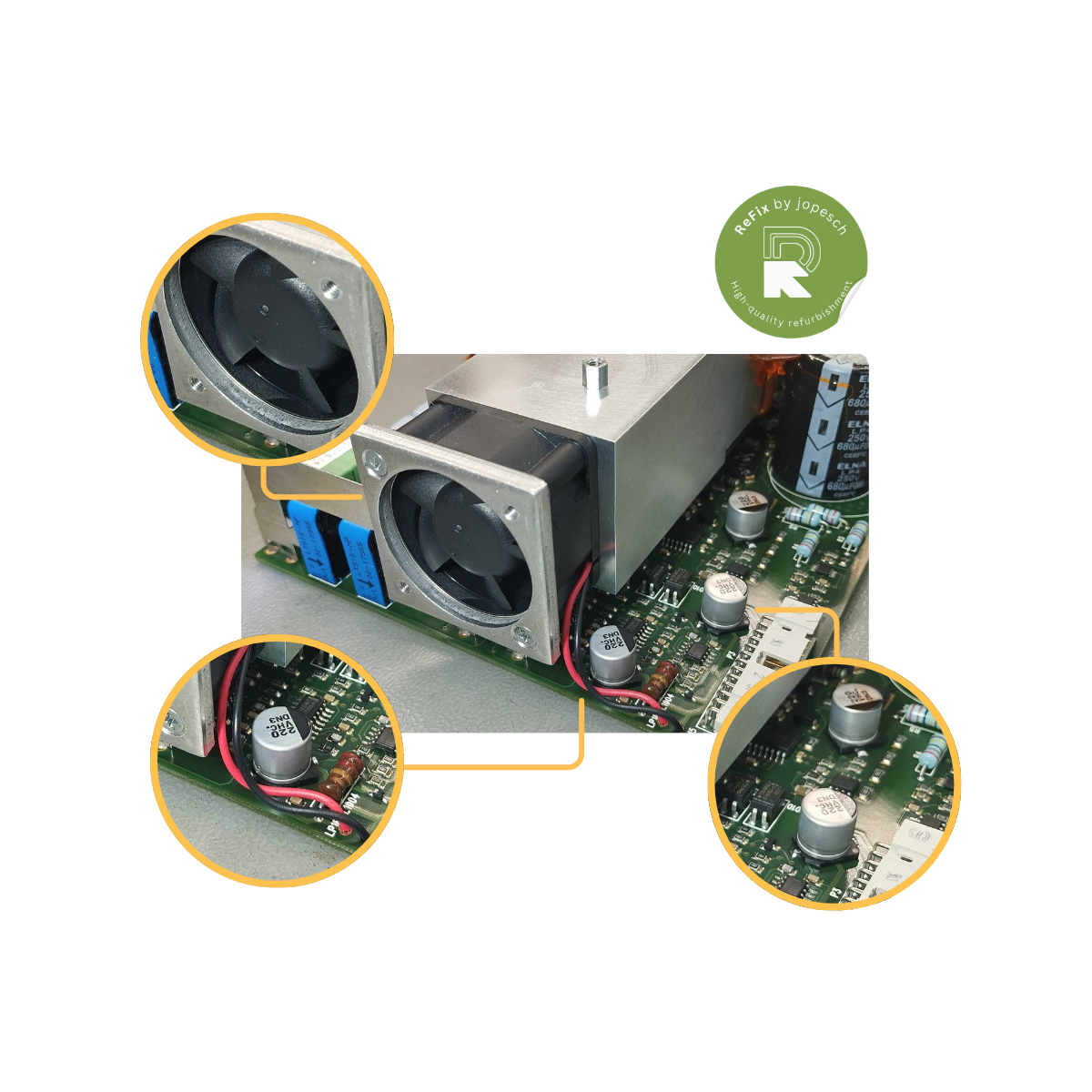 • Austausch des Lüfters um eine optimale und geräuscharme Kühlung der Leistungselektronik sicherzustellen.